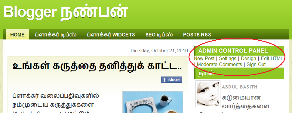 சமீப பதிவில் navbar-ஐ நீக்குவது எப்படி? என்பது பற்றி பார்த்தோம் அல்லவா?. Navbar-ல் உள்ள சிறப்பு, நாம் ப்ளாக்கர் Dashboard-க்கு போகாமலேயே புதிய பதிவுகளை பதியலாம், Design பக்கத்துக்கு சென்று மாற்றம் செய்யலாம். Navbar-ஐ நீக்கிவிட்டால் நாம் ஒவ்வொரு முறையும் Dashboard-க்கு செல்ல வேண்டும். அதற்கு மாற்றாக உள்ளது தான் Admin Gadget.